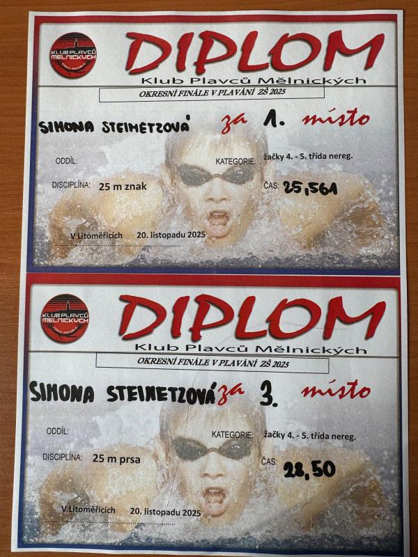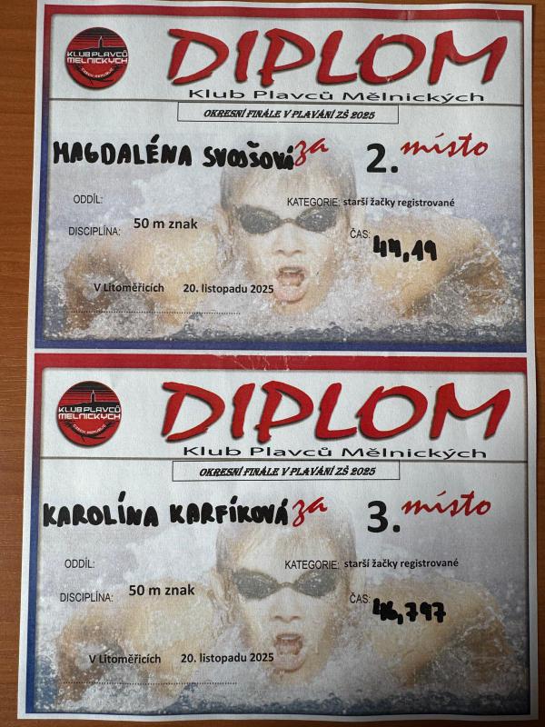 20.11. jsme se zúčastnili okresního přeboru v plavání a podařilo se nám z litoměřického bazénu vylovit celkem 5 medailí - 1 zlatou, 2 stříbrné a 2 bronzové. Všem medailistkám gratuluji a zúčastněným děkuji za reprezentaci.