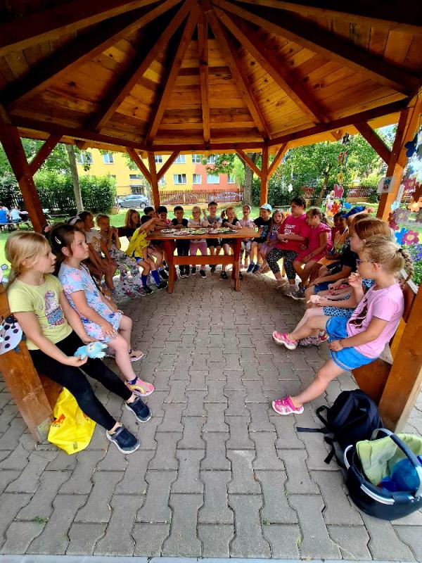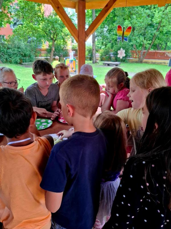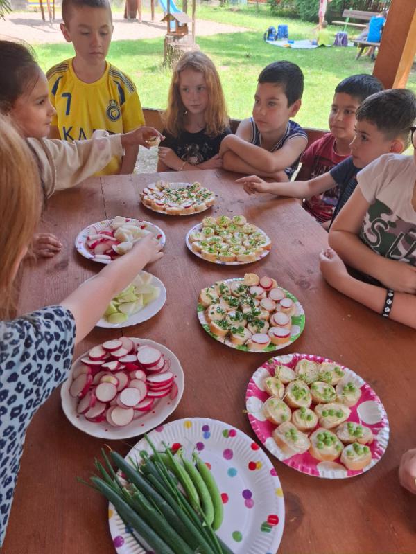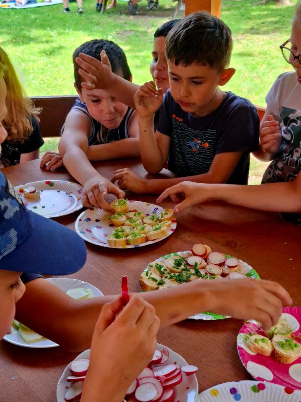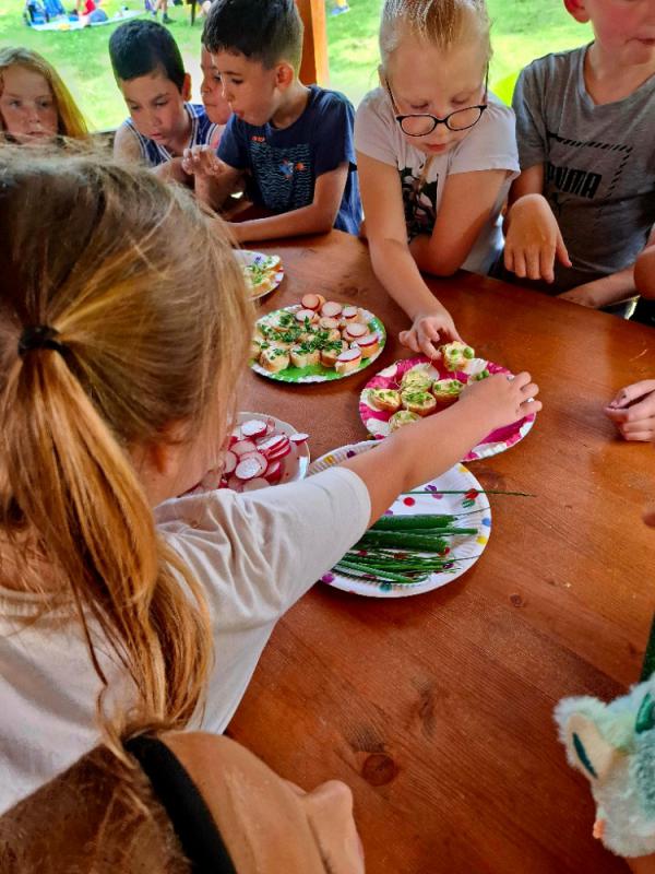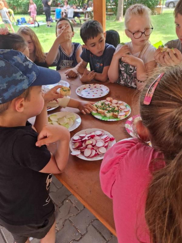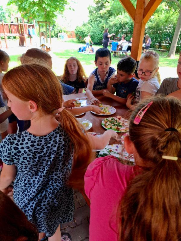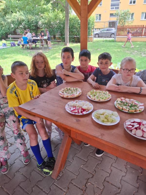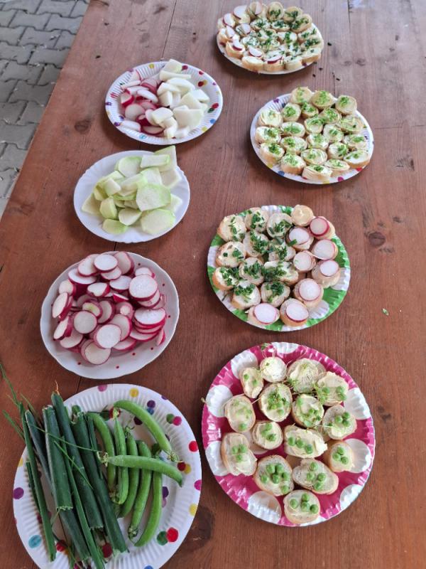 Některou zeleninu a bylinky si děti samy vypěstovaly ve vyvýšených záhonech o které se po celé jaro staraly. Vitamínové talíře byly krásně nazdobené, takže po zahájení ochutnávky jejich obsah zmizel rychle ze stolu. Na závěr jsme si řekli, že vitamíny nám pomáhají být zdraví, mít hodně energie a nebýt často nemocní.