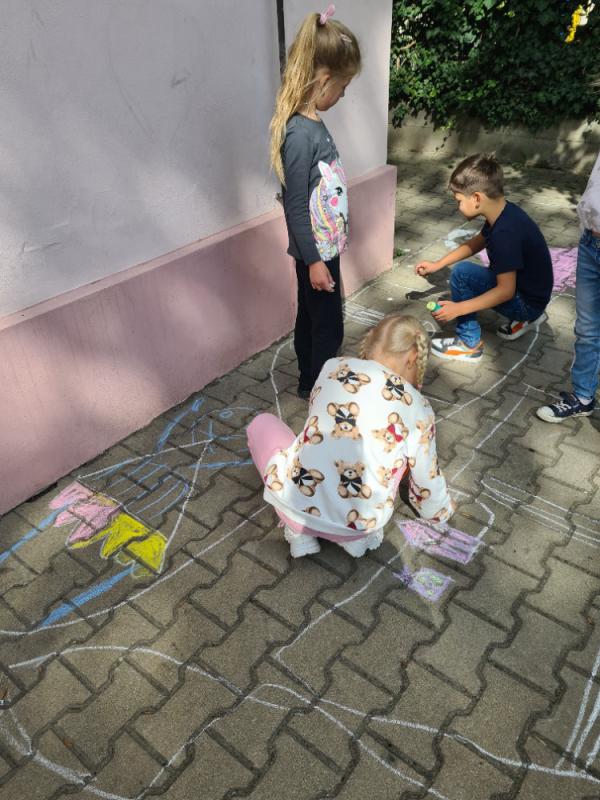 Využili jsme den plný slunce k výtvarnému tvoření. Děti z 2. oddělení kreslily křídami na chodník a vyráběly papírové ježky ozdobené vlnou. Odpoledne v družince se všem moc líbilo.