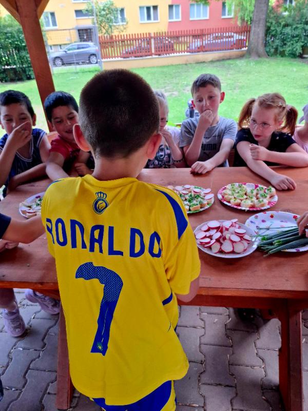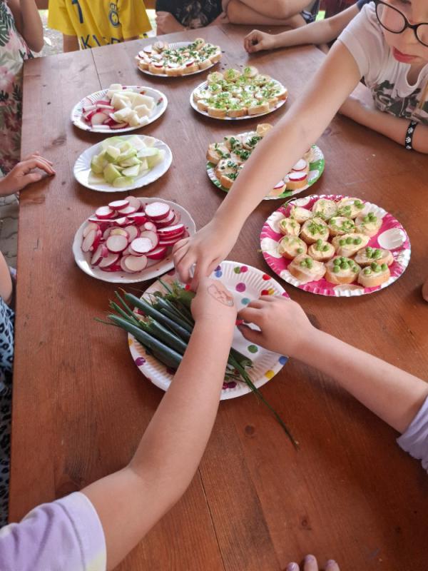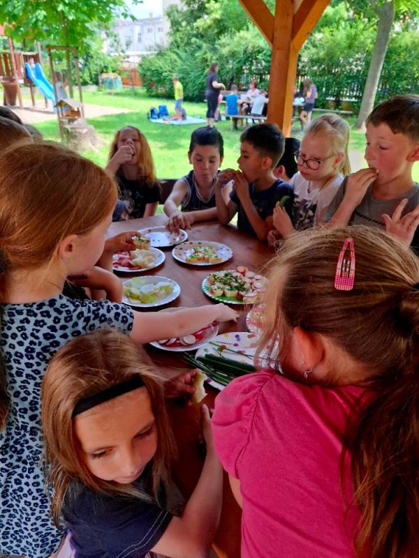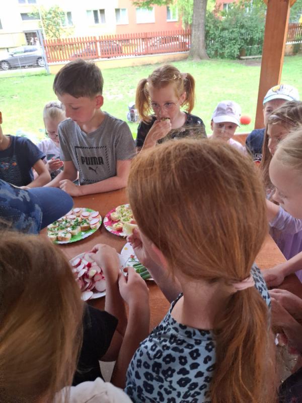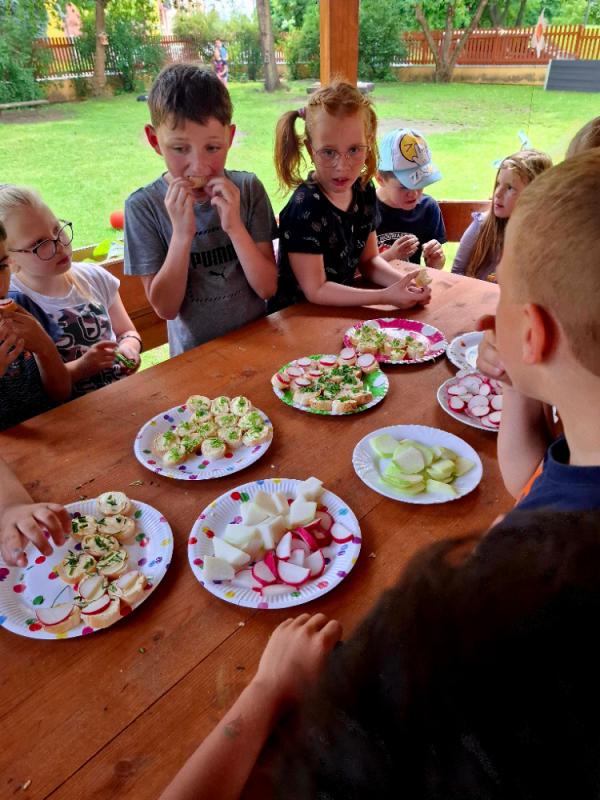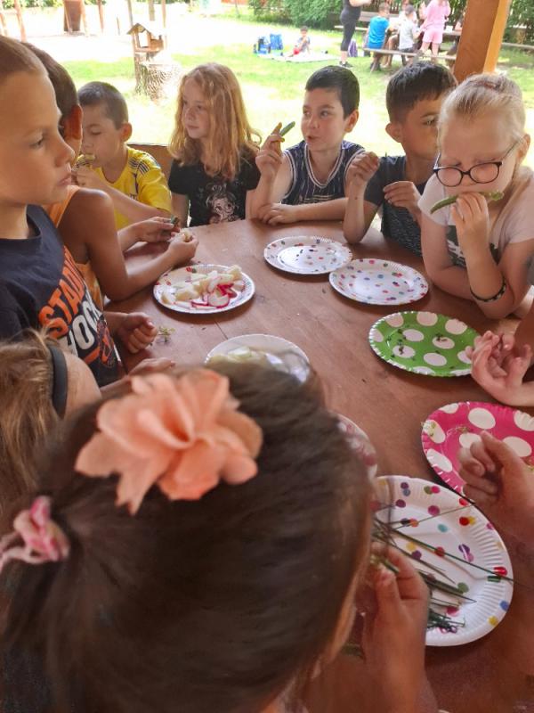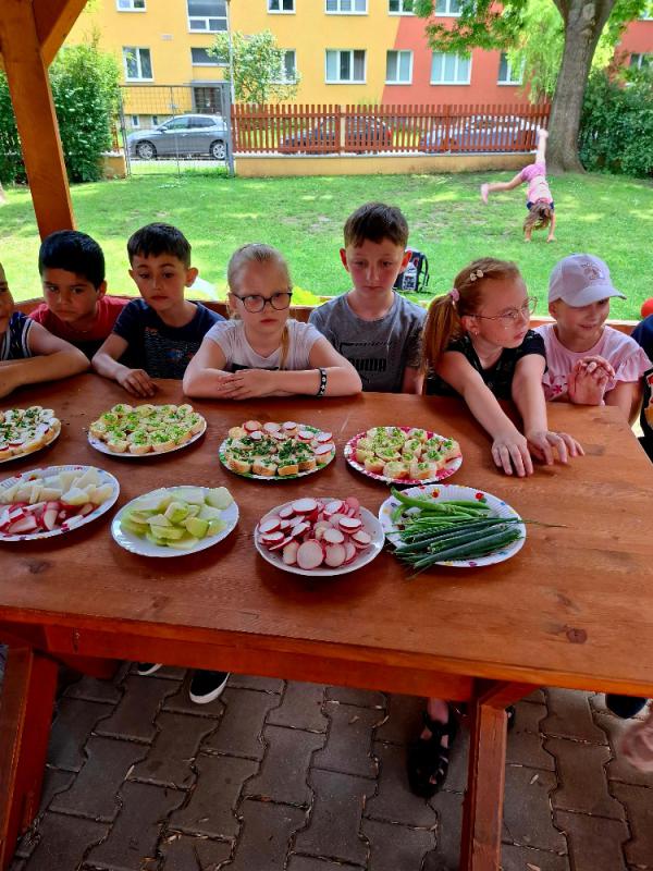Některou zeleninu a bylinky si děti samy vypěstovaly ve vyvýšených záhonech o které se po celé jaro staraly. Vitamínové talíře byly krásně nazdobené, takže po zahájení ochutnávky jejich obsah zmizel rychle ze stolu. Na závěr jsme si řekli, že vitamíny nám pomáhají být zdraví, mít hodně energie a nebýt často nemocní.